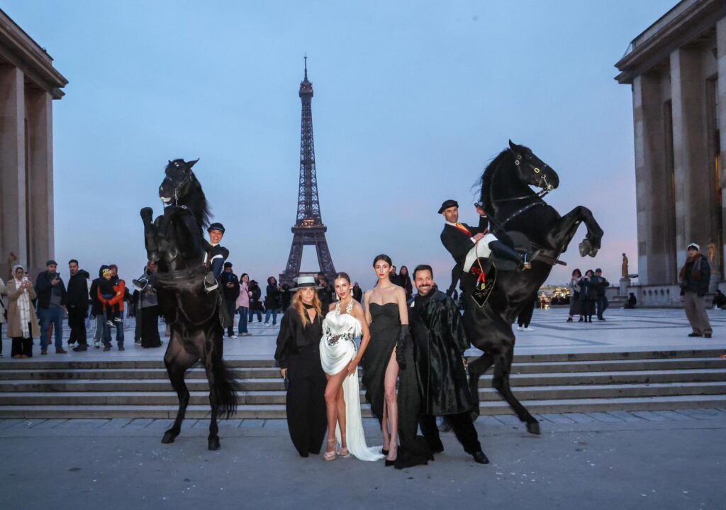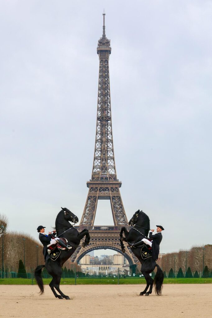 524Dos cavalls de pura raça menorquina, fent un bot, amb la Torre Eiffel de fons. És una estampa inèdita que s’ha vist aquesta setmana a París. Els dos cavalls, amb els seus genets, han viatjat des de Menorca fins a la capital de França per participar en un esdeveniment a la Setmana de la Moda d’Alta Costura.