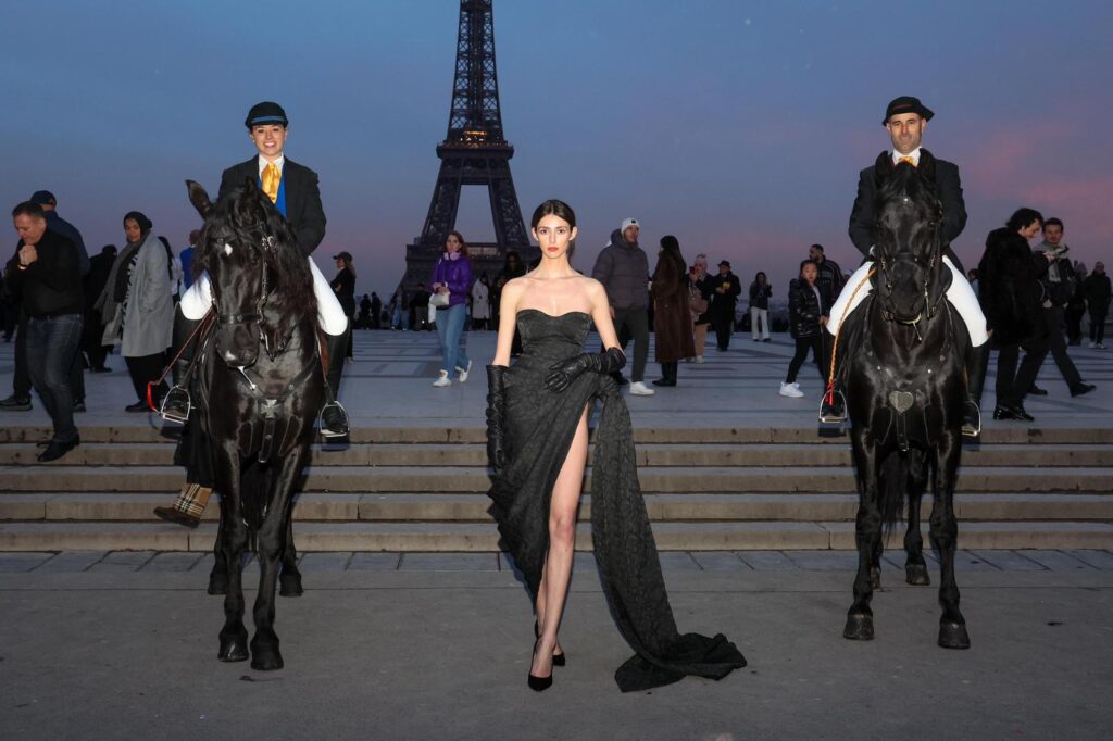Per a l’ocasió, dos cavalls negres amb els seus genets han rebut els convidats a l’entrada. Els animals han viatjat expressament des d’Espanya: de Menorca fins a Barcelona en vaixell, i d’allà fins a París en camió, ha explicat abans de la desfilada, Tolo Mercadal, president de l’Associació de Criadors del Cavall de Raça Menorquina.