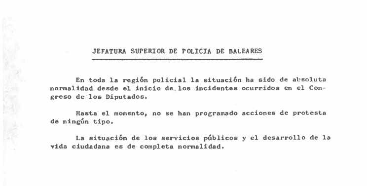 Entre la documentació, apareix un informe de la Prefectura Superior de la Policia Nacional a les Balears l’endemà de l’intent del cop d’estat. En l’informe es trasllada que la situació a les Illes és d'”absoluta normalitat des de l’inici dels incidents ocorreguts al Congrés dels Diputats”.